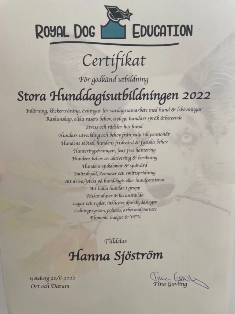 Utbildningen uppfyller Jordbruksverkets kriterier för att öppna och driva hunddagis och hundpensionat och lägger stor fokus på viktiga delar som hundens välmående, inlärning och hundträning, skötsel och lagstiftning.